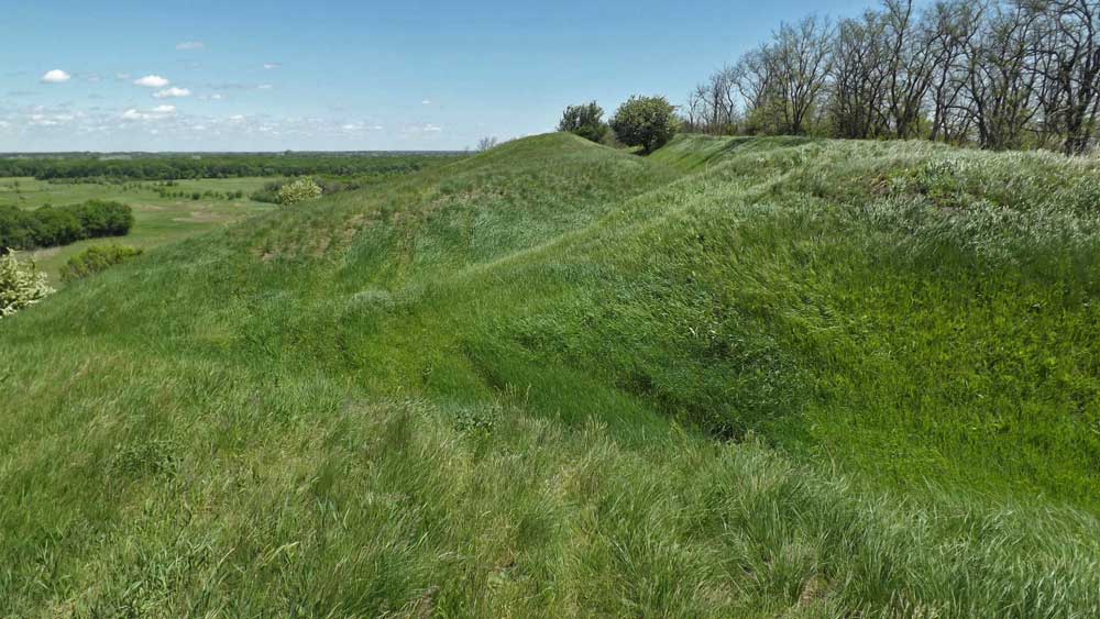 После прибытия к старту активной части маршрута, пройдя около 1 км, выходим на гребень реданного вала Украинской укрепленной линии. В этом месте земляной вал, ров, многочисленные реданы некогда грандиозного (реданный вал протяженностью 285 км от Дніпроа до Северского Донца с 17 крепостями и 40 редутами был построен в 1733-1735 годах и оградил Малороссию и Слобожанщину от регулярных опустошительных набегов Ногайской Орды) фортификационного сооружения сохранились весьма неплохо. На гребне вала, в тени старой груши – удлиненный привал (15-20 мин.), с видом на «дикое поле».